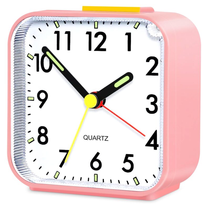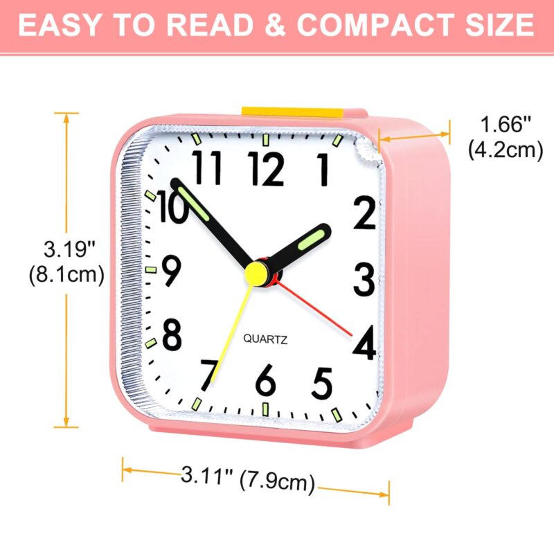 Alarm Clock, Silent Bedside Non Ticking Alarm Clocks Table Bedside Clock Battery Powered Large Display Snooze Light Clocks for Heavy Sleepers Bedrooms Office Travel (Pink)