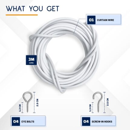 Net Curtain Wire and Hooks Set – 3 Meter Curtain wire kit with 4 Eyes & 4 Hooks – A multipurpose wire suitable for net curtains for windows – Durable wire set for window net curtain