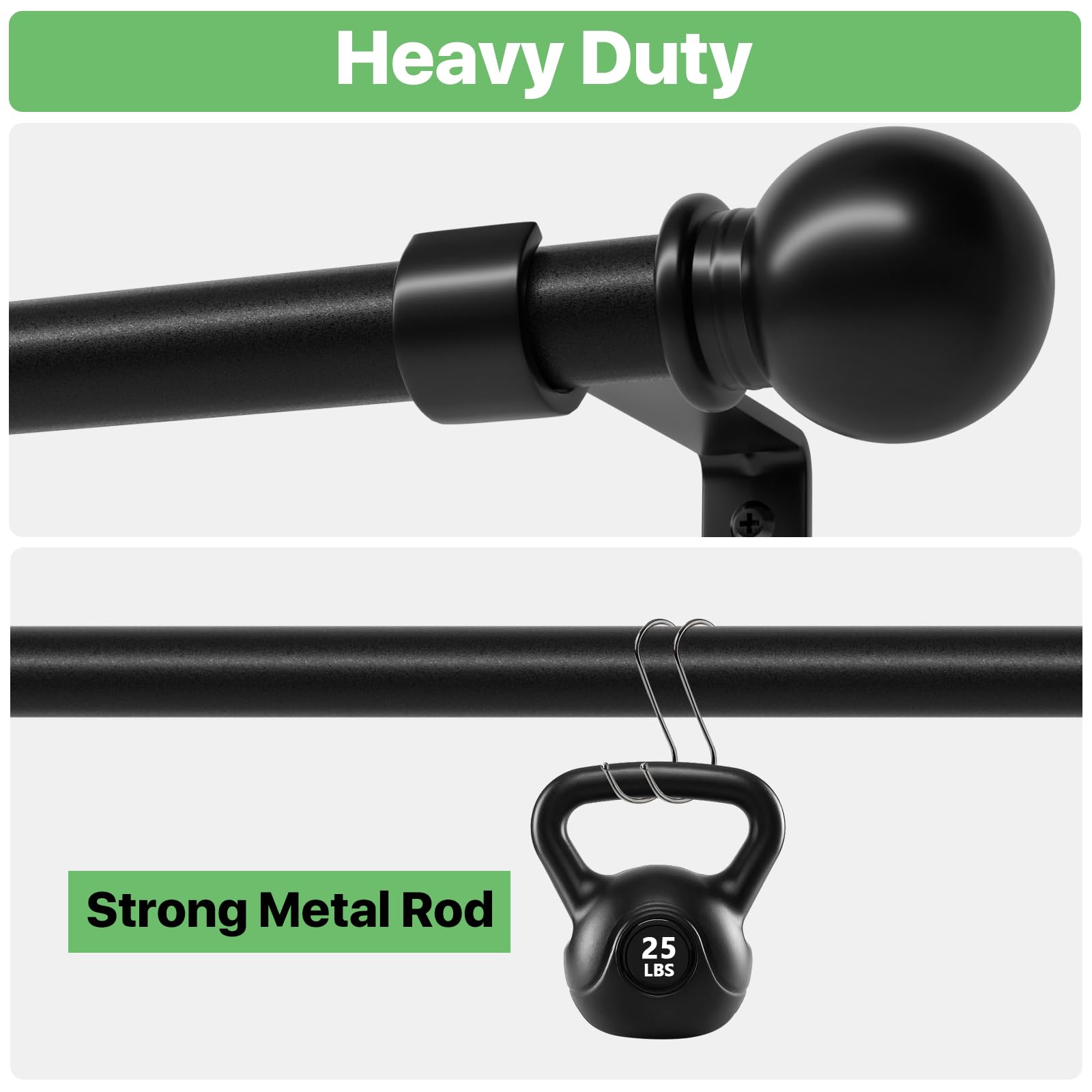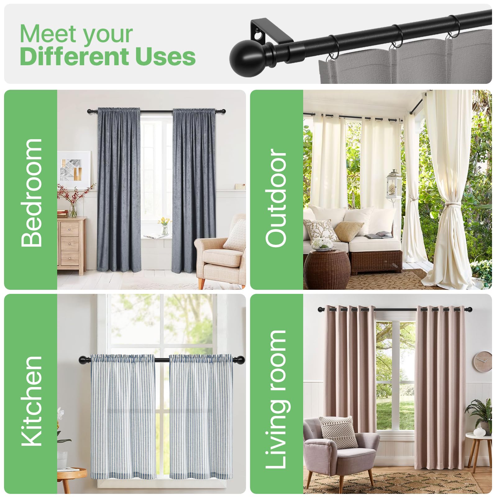 - 【Single Metal Curtain Pole with Ball Finials 】Our Curtain Pole features a matt black plating rod and standard sphere finials for a decorative look. It matches windows of multiple styles for bedrooms, living rooms, kitchens, outdoor patios, etc.