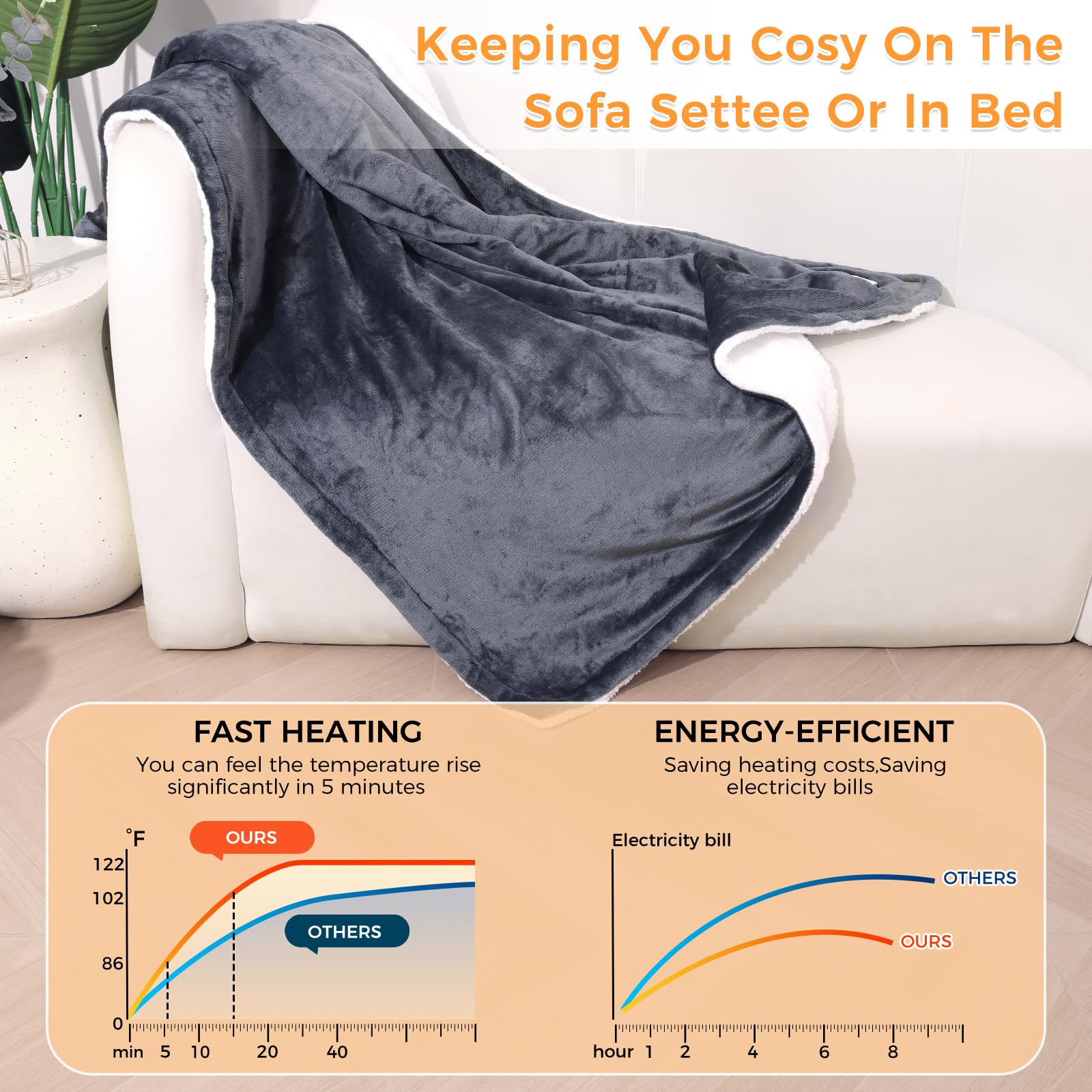- REVERSIBLE DESIGN: The heated blanket throw is made of soft flannel and sherpa cashmere. The electric blanket throw is thick and warm enough. The heating blanket provides the experience the plush micro fleece material against your skin, whether you're using the silent night heated throw as a throw on the sofa or a bedspread