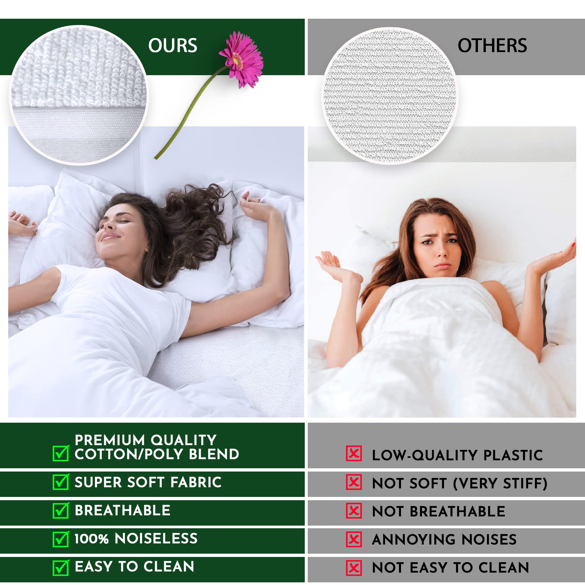 - <b>Strong Elastic and 360° Snug Fit: </b>This Extra Deep mattress protector single bed in fitted waterproof bed sheet Style design with strong elastic all around, that can ensure to avoid bunch up or slip out of place. Our waterproof mattress cover bed protector side skirt can perfectly fit mattresses height up to 12 inches/30cm.ed
